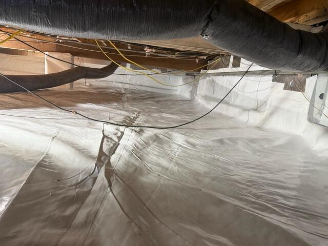 Quality 1st Basement Systems removed the damaged fiberglass from this Lacey Township, NJ crawl space and installed CleanSpace vapor barrier. Now the crawl space is dry and insulated!